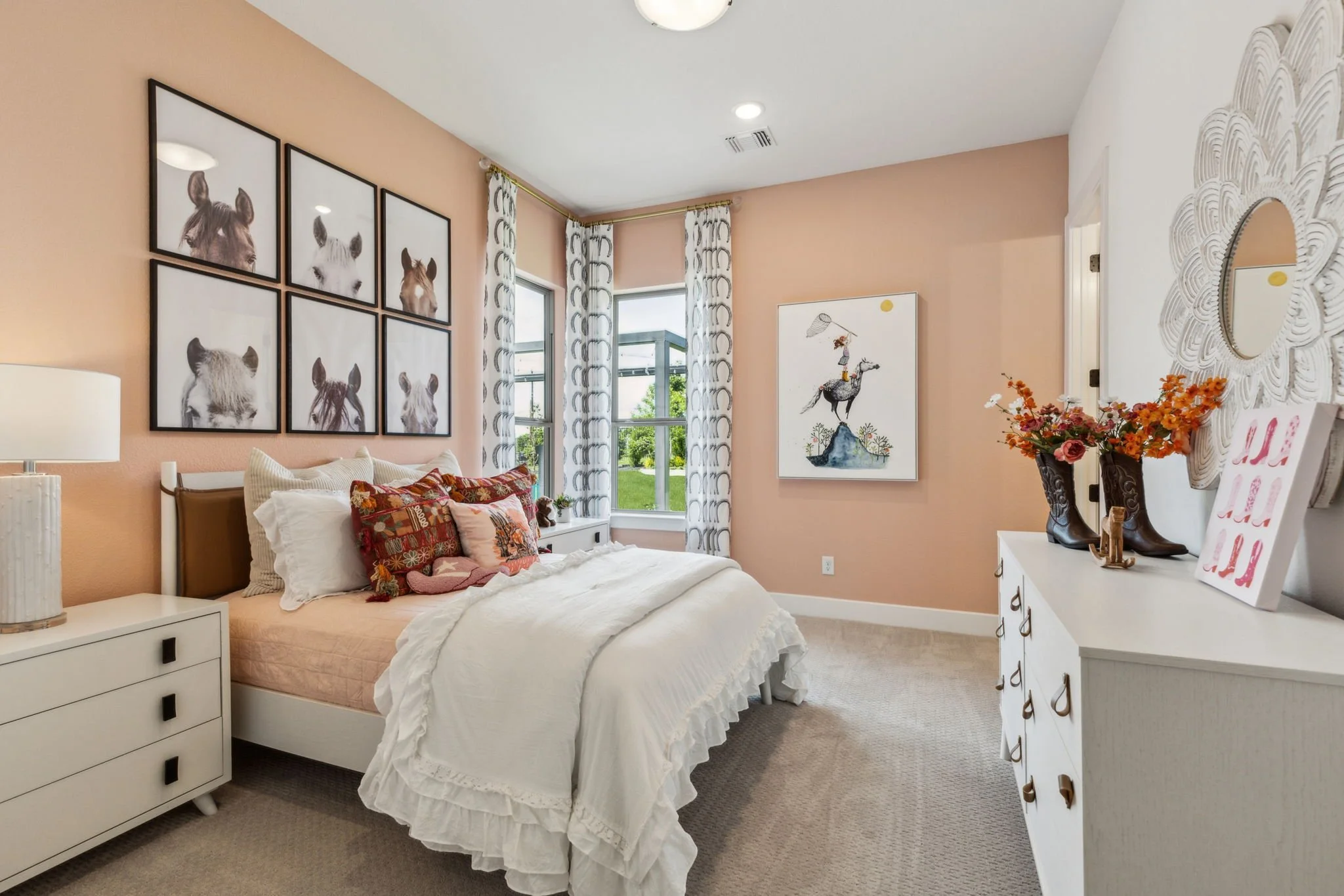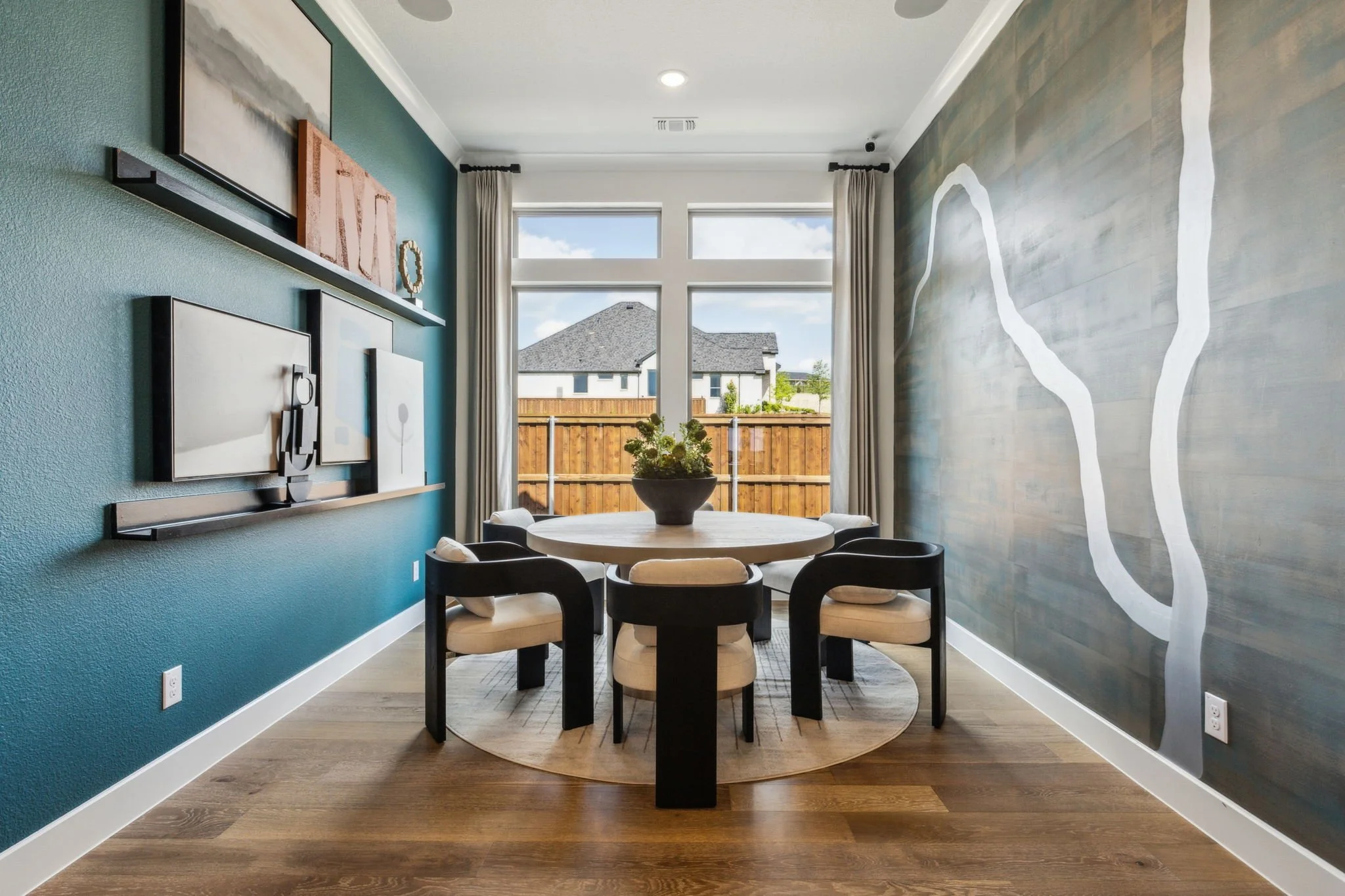 The design of this model home blends elevated style with inviting livability. Rich wood tones, layered textures, and thoughtfully curated accents create a modern-yet-timeless feel. Each space is styled to feel intentional and approachable—whether it’s the sleek, neutral living room or the bold, playful media room. The overall effect is a cohesive and beautifully merchandised home that’s both trend-forward and comfortable.